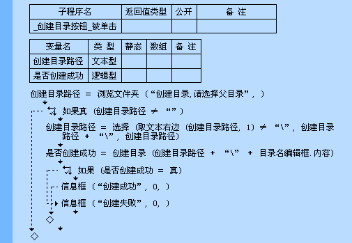 按钮被点击后弹出一个“浏览文件夹”对话框,选择一个路径后,将该路径存放在“创建目录路径”变量中,然后和“目录名编辑框”中的内容组成了要创建文件夹的完整路径名,并用“创建目录”命令创建它,将创建结果存放在“是否创建成功”变量中,最后用信息框显示是否创建成功。