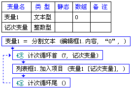 将编辑框1.内容按照”0”进行分割,分割后的数组放到变量1中,因为变量1中有7个成员,所以循环7次,依次将变量1的成员放到列表框中。
