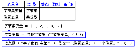 在字节集{1,2,3,4,5}中寻找字节集{3},由于字节集{3}在第三个位置上,将返回位置数据3,如果没有需要寻找的内容,将返回-1。
