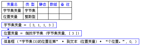 第一个参数填入被寻找的字节集,我们这里用{3,1,1,3}表示,第二个参数,欲寻找的字节集,我们寻找{3},即在字节集{3,1,1,3}中,从后向前,倒找字节集,将返回的位置信息放入信息框中。