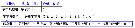 把字节集{2,2,2,1,3,3,3}分割,用作分割的字节集为{1},返回分割后的字节集数组,例程中分割后的结果应该为2个成员的数足,分别是{2,2,2}和{3,3,3}。