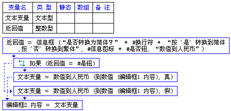 消息框询问用户,选择转换简体或繁体,返回值为整数型变量,保存用户按下按钮类型(是钮或否钮)。返回值为是钮,参数二为真,为否钮,参数二为假。