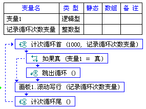 在循环中,如果变量1为假,就会运行画板1.滚动写行的命令(画板会显示出1000以内的整数),如果是变量1为真,就会运行跳出循环命令,直接跳过了画板1.滚动写行的命令,这个循环会直接结束。