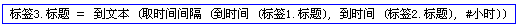 标签1.标题和标签2.标题中写的是2个文本型的时间,先把它们转换到日期时间型,我们在用取时间间隔命令取出2个时间数据间隔多少小时,这里也可以取其他的时间间隔,例如“年份”“季度”“月份”等,这取决于第三个参数,再把返回的日期时间型数据转换到文本型,放入到标签3.标题中去。