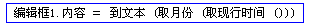 把取现行时间返回的这个日期时间型数据的月部分,用取月份命令取出来,显示在编辑框1中。