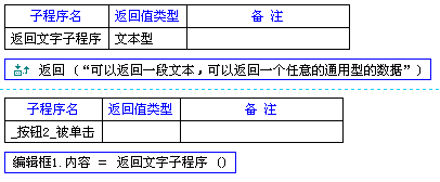 例子中,新建了一个子程序,利用返回命令,返回给调用子程序方这样一段文本:“可以返回一段文本,可以返回一个任意的通用型的数据”要想利用这个子程序返回值,可以用编辑框1.内容 = 返回文字子程序 ()的命令,这样,编辑框1就把返回文字子程序 ()子程序的返回值,显示在了编辑框中