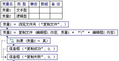 再浏览文件夹,选择一个路径,将新文件路径放入变量1中;将编辑框1的内容复制到一个新文件中。如果复制成功,变量2=真,否则为假