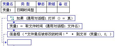 打开通用对话框1,选择一个文件,取得它最后被修改的时间放入变量1中。