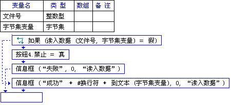 如果读入数据失败,按钮4被禁止,弹出一个信息框显示“失败”;如果读如数据成功,信息框显示“成功”+字节集变量中的内容。