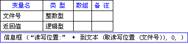 信息框 (“读写位置:” + 到文本 (取读写位置 (文件号)), 0, )执行成功后,将在信息框里显示“读写位置:”加上用取读写位置()所取出的位置号;失败将在信息框里显示“读写位置:”+ -1。