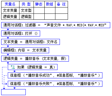 文本变量为文本型,保存用户选择的一个以 .WAV .MID 为后缀的文件名的路径。逻辑变量为逻辑型,保存逻辑值(真或假),如果为真,消息框显示“播放音乐成功”,为假,消息框显示“播放音乐失败”。