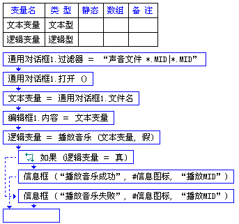 逻辑变量保存播放是否成功的逻辑值(真或假),为真,信息框显示“播放音乐成功”,为假,信息框显示“播放音乐失败”;文本变量保存用户选择声音文件的路径,包括以 .MID 为后缀的文件名称。