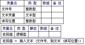 返回值 = 插入文本 (文件号, 到文本 (读写位置))执行成功,将在文件号所对应的插入文本。后返回值=“真”;如果执行失败,返回值=“假”。