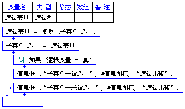 逻辑变量为逻辑型,子菜单.选中 为逻辑型。在此例程中,逻辑变量保存 子菜单.选中 的反值(真的反值为假),然后将逻辑变量保存的真或假,赋值给 子菜单.选中。