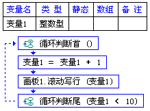 在循环判断尾判断,只要变量1小于10,就不断循环,直到变量1加到10,循环结束。所以画板滚动写入的是1-10十个数。