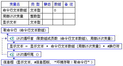 命令行文本数组保存用取命令行()取出的文本数组,用取数组成员数()取出命令行文本数组的成员数进行计次循环,每循环一次,显示文本都将原来显示文本的文本和取出的文本保存。然后用信息框显示。