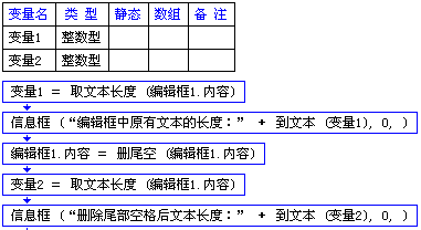 先取出编辑框中原有内容的长度,放到变量1中,用信息框显示出来;再删除原有内容的尾部空格,将新内容放入编辑框中;再取新内容的长度,放入变量2中,由信息框显示出来。