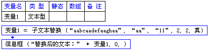 语法: 文本型 子文本替换 (欲被替换的文本,欲被替换的子文本,[用作替换的子文本],[进行替换的起始位置],[替换进行的次数],是否区分大小写)